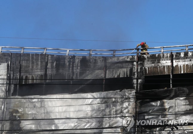 (용인=연합뉴스) 홍기원 기자 = 6일 오전 경기도 용인시 처인구의 한 물류센터 신축공사 현장에 불이 나 소방관들이 진화작업을 하고 있다.